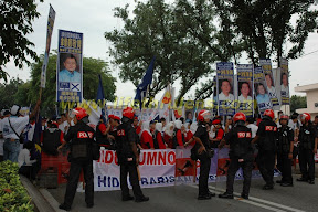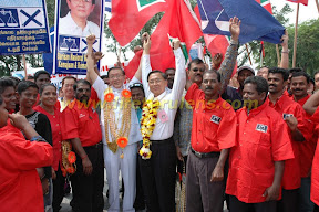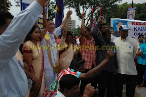 Being a registered voter in my hometown (which is a mere 30 minutes from my current location), I took the weekend opportunity to see for myself the happenings at the nomination centre. The nomination for parliament seat P110 (Klang) and its 3 state seats (Port Klang N46, Pandaraman N47, and Kota Alam Shah N48) was held at Dewan Hamzah. I got an SMS from a friend saying the supporters for Manoharan will be marching from Chetty Padang (field) instead of Lecthumanan Hall as mentioned a day earlier. Anyway, I reached Dewan Hamzah at about 9.15am, by which the candidates were already in the nomination centre. The police had closed some of the roads, so I had some problem finding parking. Managed to park behind the Dewan and walked up the stairs.