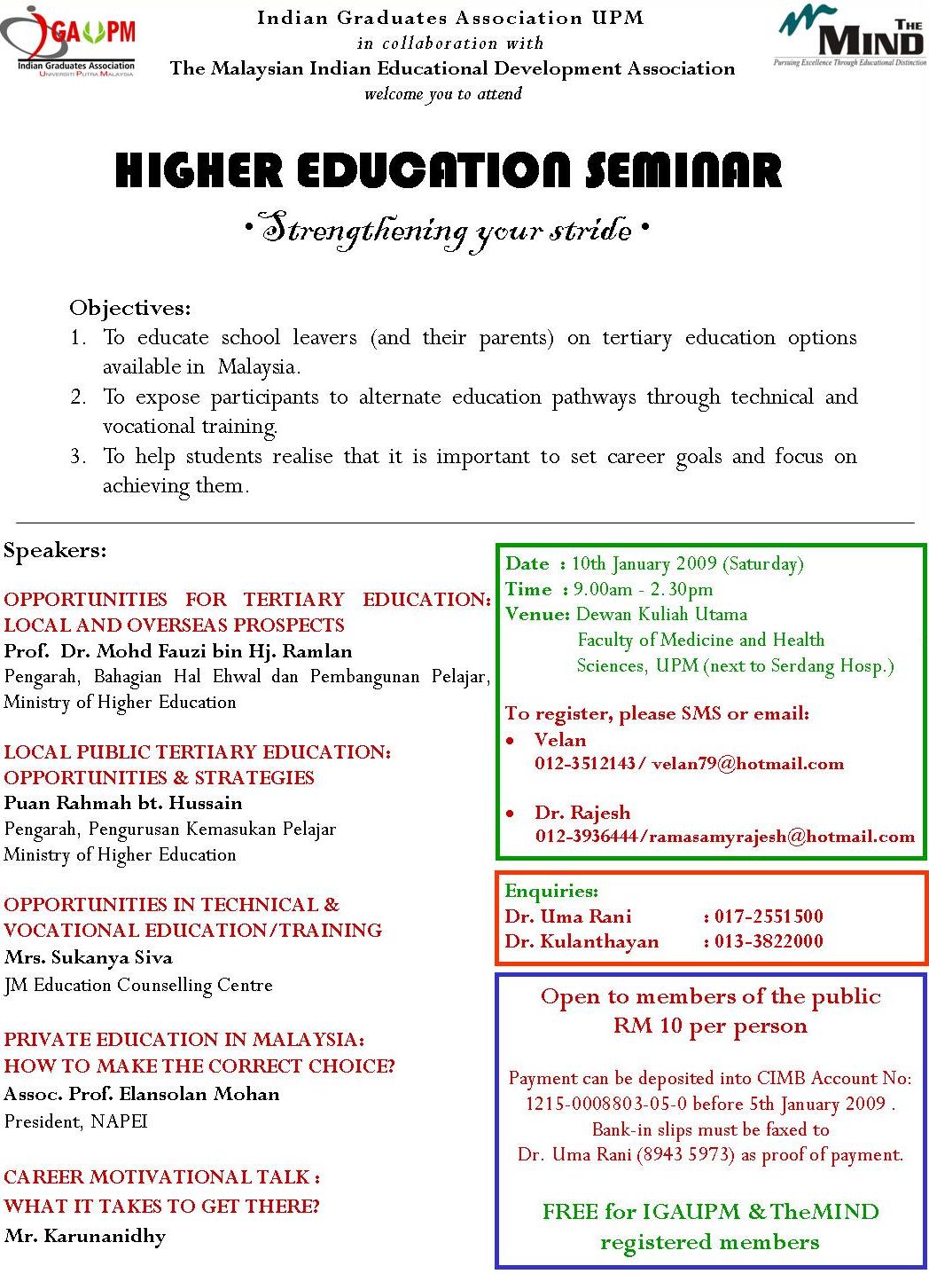 The Mind and IGAUPM is organising a Higher Education Seminar on 10th January 2008. I think it will be a good place for students and parents alike to get information and exposure to the education industry and career prospect.